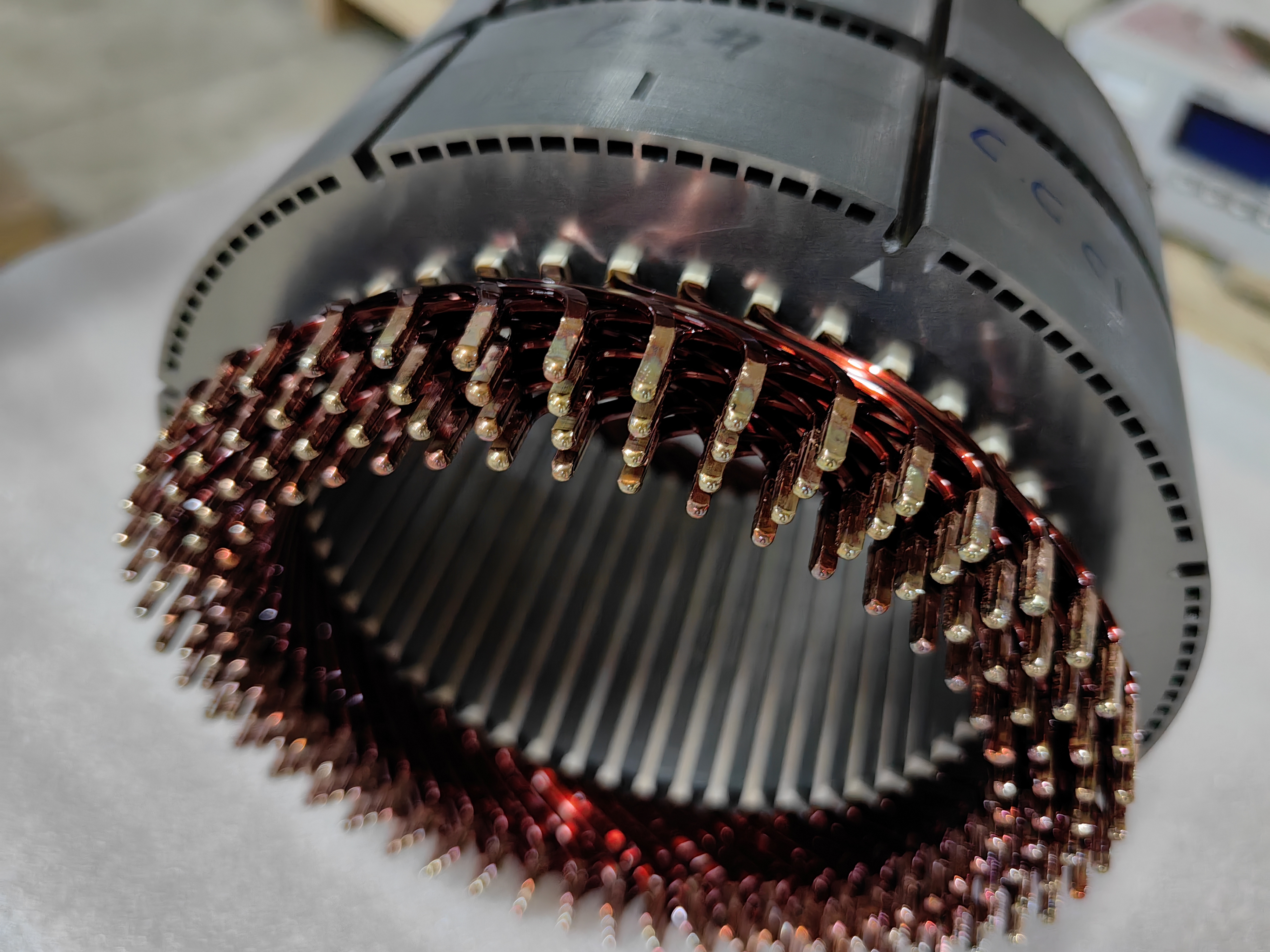 (1)鐵芯上絕緣紙(B形、S形、O型)→(2)漆包扁線(xiàn)下線(xiàn)去漆成U型→(3)異形線(xiàn)定長(cháng)下線(xiàn)去漆→(4)異形線(xiàn)成型→(5)星點(diǎn)線(xiàn)焊接→(6)人工預插線(xiàn)入定子鐵芯→(7)線(xiàn)圈整形壓入鐵芯→(8)非出線(xiàn)端自動(dòng)伺服扭頭并自動(dòng)消除回彈角→(9)非出線(xiàn)端線(xiàn)頭自動(dòng)切平→(10)非出線(xiàn)端自動(dòng)TIG焊接→(11)三相引出線(xiàn)焊接。